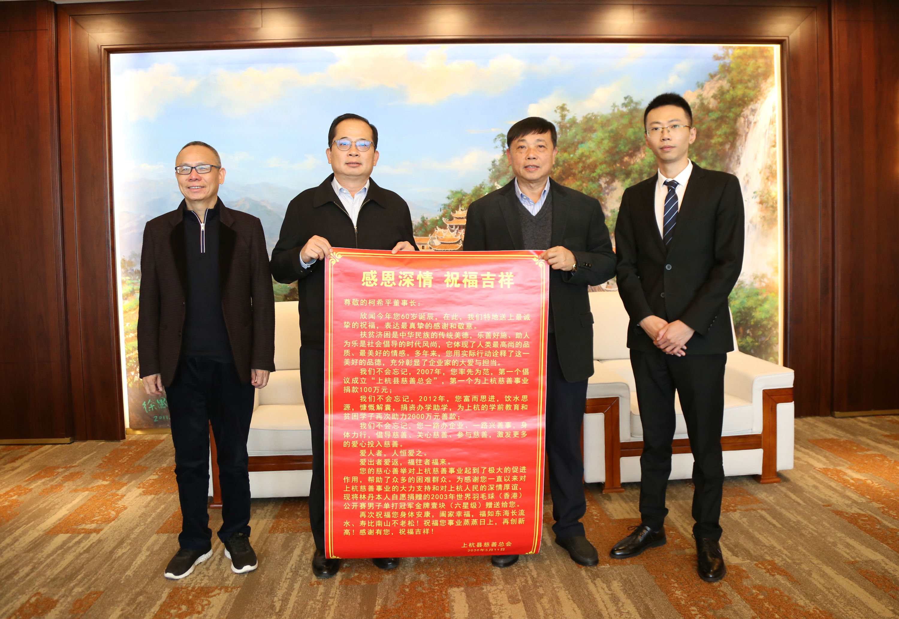 12月10日上午,上杭縣慈善總會一行,攜“感恩深情,祝福吉祥”主題的大海報,向廈門恒興集團和董事長柯希平先生表達謝意,其中記錄了恒興集團和上杭縣慈善總會的緣分:“2007年,柯希平董事長倡議成立上杭縣慈善總會,為上杭慈善事業捐款100萬元;2012年,柯希平董事長飲水思源,為上杭的學前教育和貧困學子再次助力2000萬元善款,用實際行動彰顯企業家的大愛與擔當。”