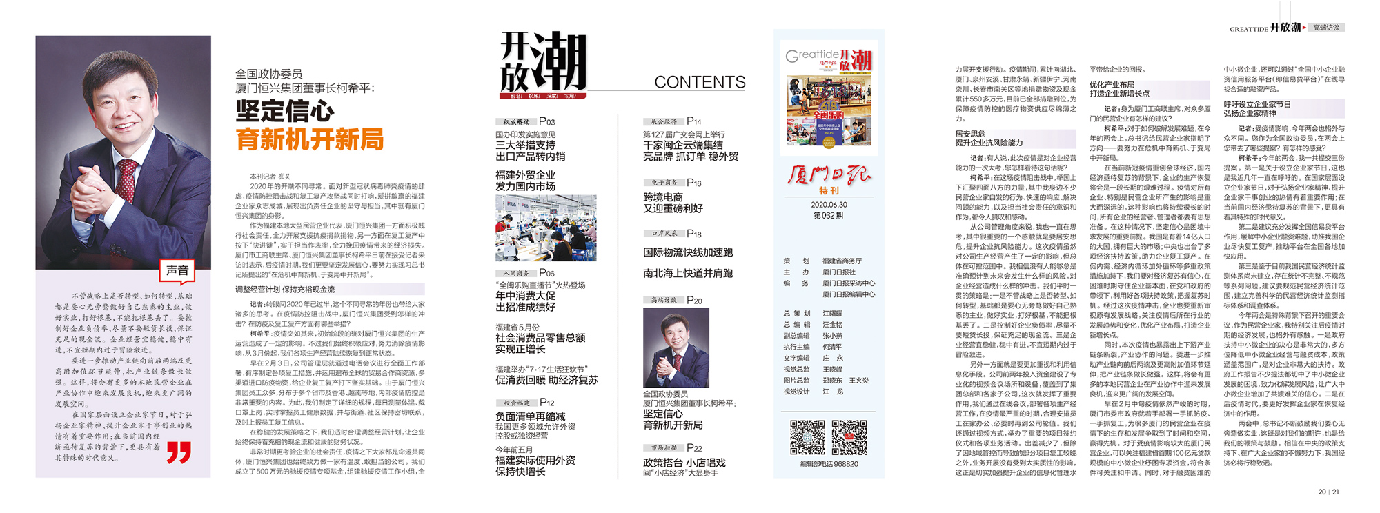作為福建本地大型民營企業代表,廈門恒興集團一方面積極踐行社會責任,全力開展支援抗疫捐款捐物,另一方面在復工復產中按下“快進鍵”,實干擔當作表率,全力挽回疫情帶來的經濟損失。廈門市工商聯主席、廈門恒興集團董事長柯希平日前在接受記者采訪時表示,后疫情時期,我們更要堅定發展信心,要努力實現習總書記所提出的“在危機中育新機、于變局中開新局”。